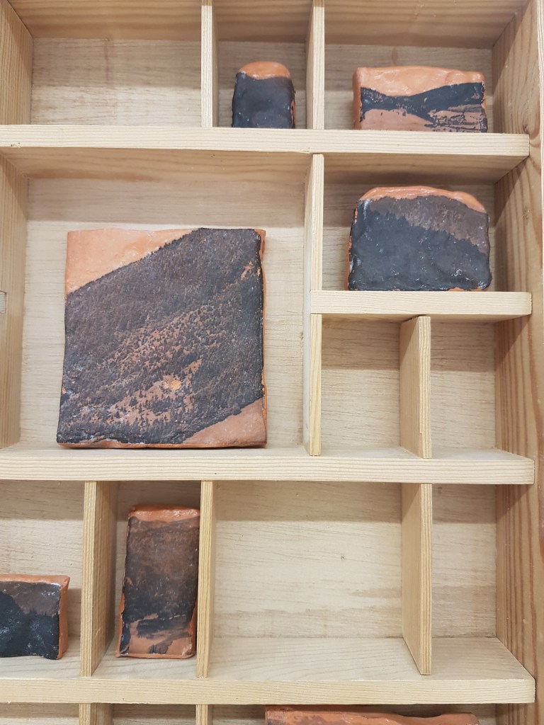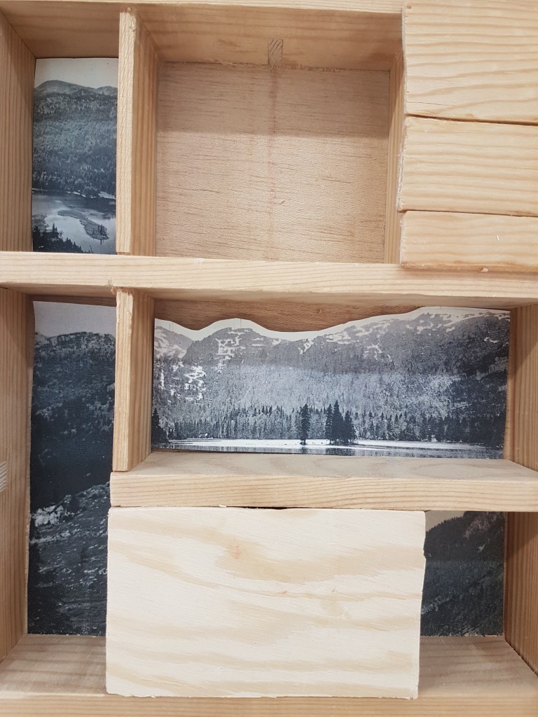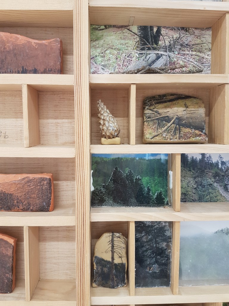 wooden type case filled with historical pictures, forest objects, printed ceramics and plexiglas.
